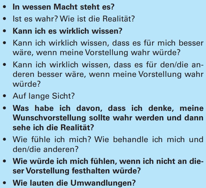 Wenn du nun ein paar Sätze formuliert hast, nimmst du einen davon und stellst dir jede einzelne der nachfolgenden Fragen nacheinander: