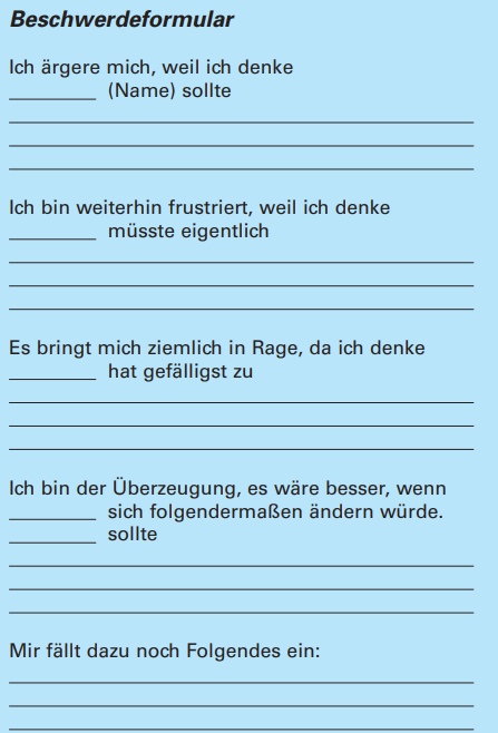 Diese Übung dient als Vorbereitung für die Übung „Hinterfragen des Denkens“. Fülle folgendes Beschwerdeformular aus: