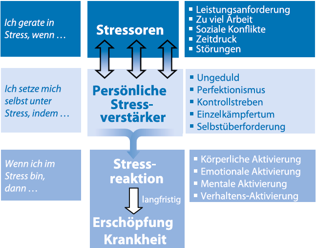 Persönliche Motive, Einstellungen und Bewertungen können individuelle Stressverstärker darstellen, die Stressreaktionen auslösen und verstärken (Kaluza, 2011, S. 14). Diese Aspekte stellen sozusagen den eigenen Anteil des Betroffenen am Stressgeschehen dar. Beispiele für individuelle Stressverstärker sind Entwicklungsbestreben, Perfektionismus und auch die Unfähigkeit, eigene Leistungsgrenzen zu akzeptieren. Eine stressverschärfende Wirkung hat ebenso eine Einzelkämpfer-Mentalität, die es nicht erlaubt, von anderen Unterstützung anzunehmen. Unseres Erachtens ist die Erkenntnis, dass man sich unter Druck setzt, um innere Leere, depressive Verstimmungen, Gefühle von Sinnlosigkeit und Einsamkeit nicht aufkommen zu lassen, höchst spannend. Stress wird also auch als Mittel genutzt, um vor sich selbst zu flüchten (ebd.). In der unterstehenden Abbildung wird der theoretische Abschnitt übersichtlich dargestellt: