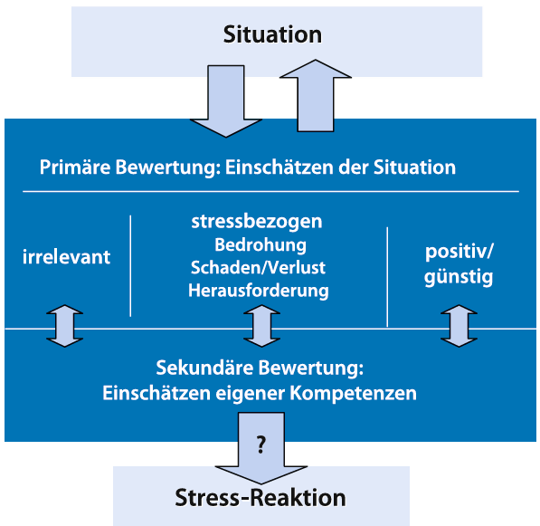 Lazarus (1984) geht davon aus, dass Personen den Stressoren in ihrer Umwelt nicht passiv ausgesetzt sind, sondern dass sie sich zu den gegebenen Anforderungen selbst aktiv in Beziehung setzen. Dabei spielen Prozesse in Form von bewertenden Wahrnehmungen, Gedanken und Schlussfolgerungen eine entscheidende Rolle. Es wird grundsätzlich in zwei Bewertungsvorgänge unterschieden, deren Ausgänge entscheidend dafür sind, zu welcher Stressreaktion es kommt (ebd.).